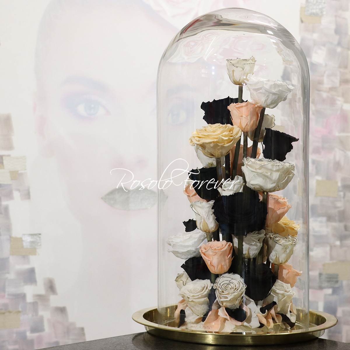Belles roses stabilisées sur tige, sous notre plus grande cloche en verre.