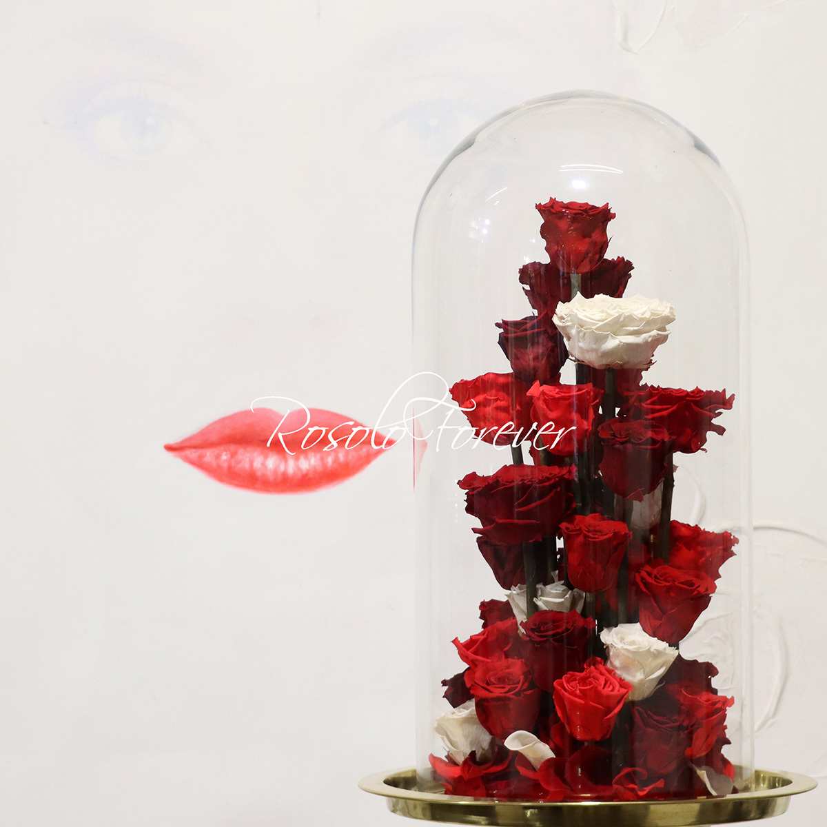 Belles roses stabilisées sur tige, sous notre plus grande cloche en verre.