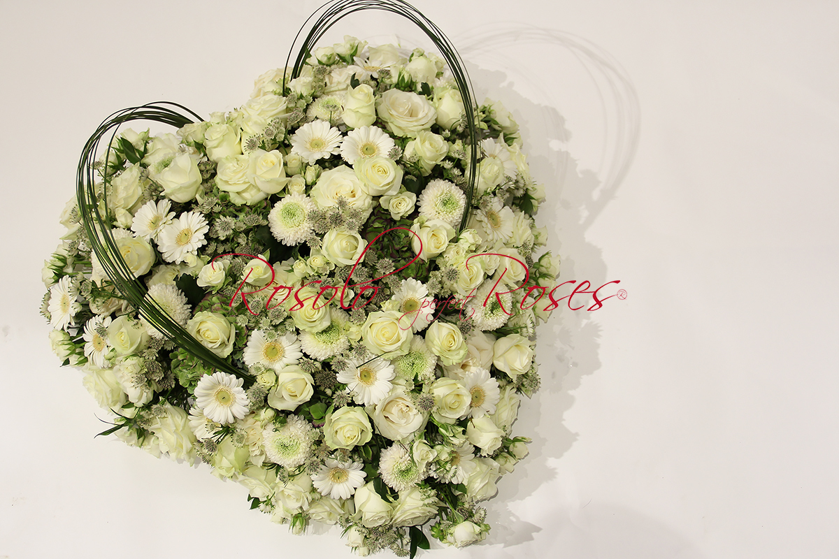 Un beau cœur de roses blanches arrangées avec une garniture de saison sobre
