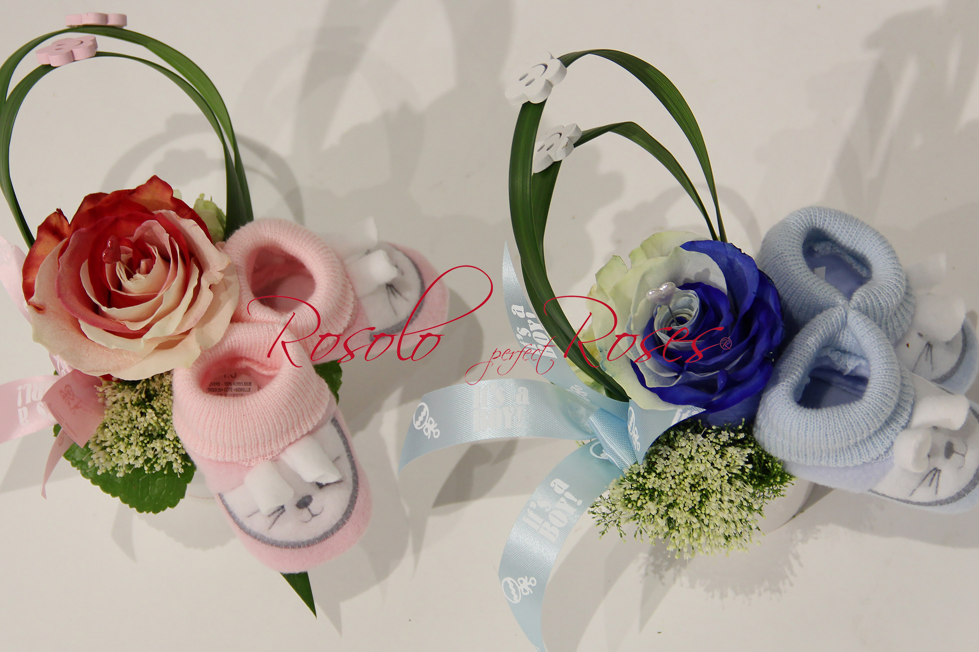 Très belle rose originale, bicolore avec jolie garniture de naissance, arrangée dans un joli petit pot en céramique ou en verre.