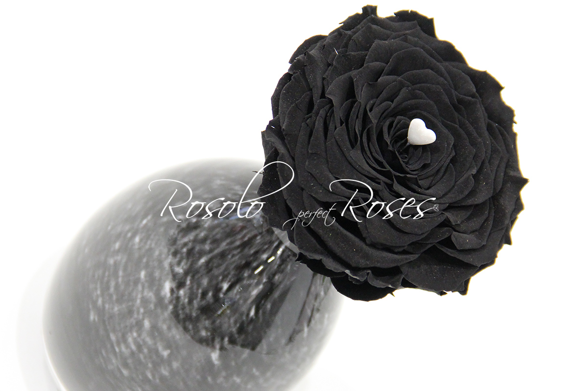 Une vraie rose, cueillie et coupée au meilleur moment, toute épanoui. Cette rose a été séchée et teintée en noir. Sans eau et à l'abris du soleil elle reste belle durant 6 à 12 mois.