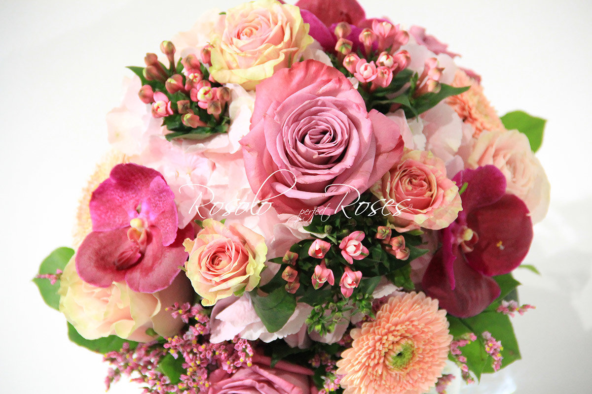 Superbe bouquet généreux, arrangé avec magnifiques roses parfumées (Moody Blues), des orchidées et des fleurs de saison